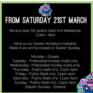 Open to Walk ins school holidays Thursday-Sunday. We run Prebooked closed session holiday clubs Tuesday-Wednesday.